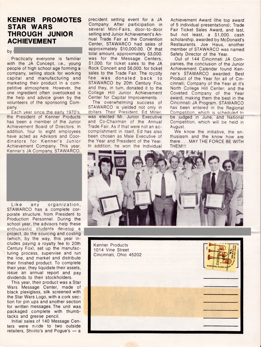 This item, from Kenner's newsletter dated summer 1981, tells us that Starwarco was named Company of the Year for the Cincinnati area. Obviously, the unfair advantage provided by Kenner's association with the Star Wars license was still bearing fruit!